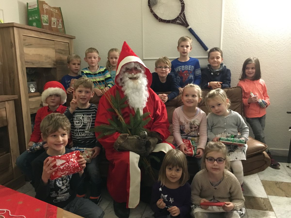 Karin Fairon spielte Weihnachtslieder auf der Gitarre und alle sangen mit. Nach einiger Zeit klopfte es an der Tür und der Weihnachtsmann kam herein. Ganz lieb erzählten die Kleinen ihre Gedichte und Lieder. Ein kleiner Frechdachs war doch dabei und bekam die Rute. Nach dem Verabschieden des Weihnachtsmannes ging es ans Auspacken der Geschenke und alle waren glücklich. Zum Schluss schauten wir einen Weihnachtstrickfilm und ließen uns die Wiener schmecken.